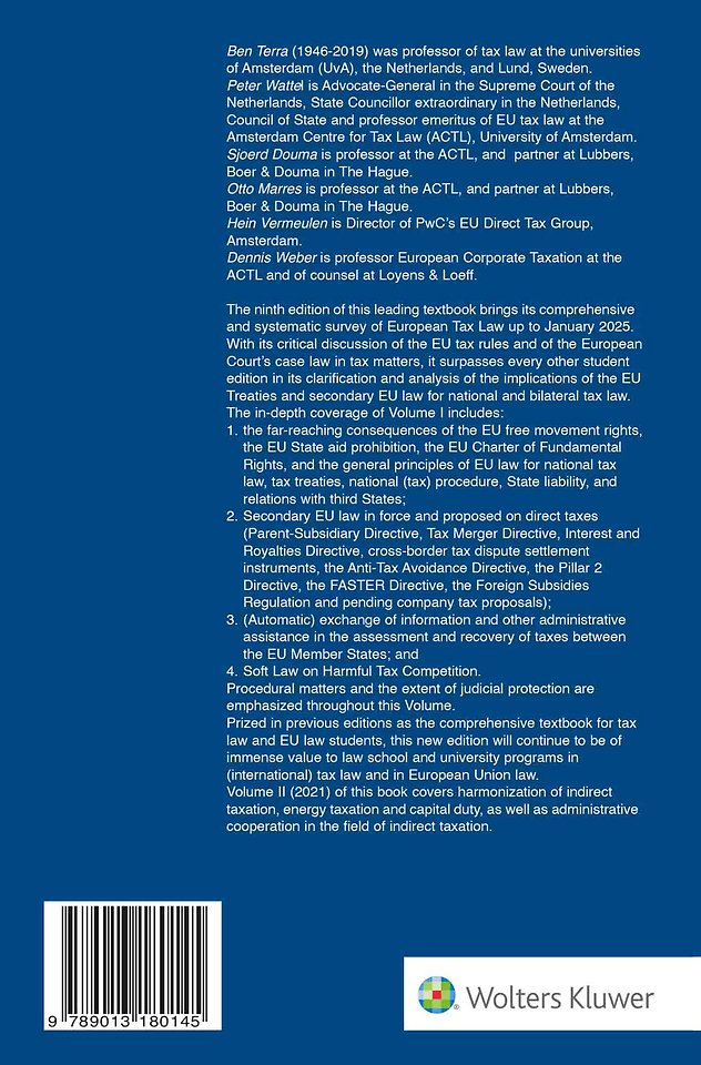The ninth edition of this highly acclaimed book offers a comprehensive and systematic survey of European Tax Law up to January 2025. With its critical discussion of the EU tax rules in force and of the EU Court’s case law in tax matters, it surpasses every other publication on European tax law.