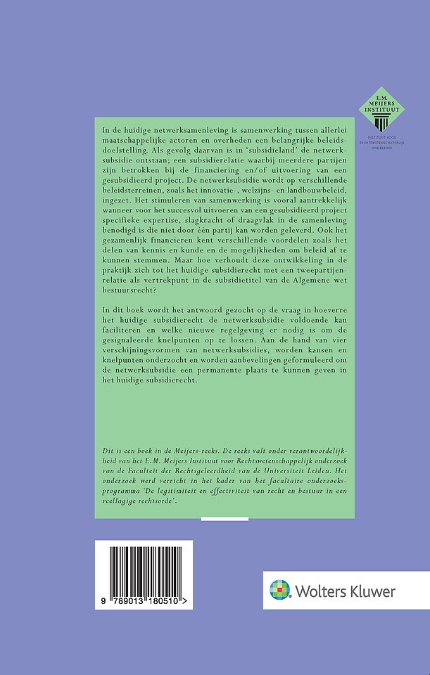 Netwerksubsidies onderzoekt hoe het huidige subsidierecht de netwerksubsidie faciliteert en in hoeverre nieuwe regelgeving nodig is om juridische knelpunten op te lossen. Daarbij wordt gekeken naar vier verschillende praktijkvormen van netwerksubsidies. Naast het juridische kader wordt ook de bestuurskundige ontwikkeling naar een netwerksamenleving geanalyseerd. Tot slot biedt de publicatie aanbevelingen voor beleidsmakers en juristen om netwerksubsidies beter te integreren in het bestaande juridische systeem.