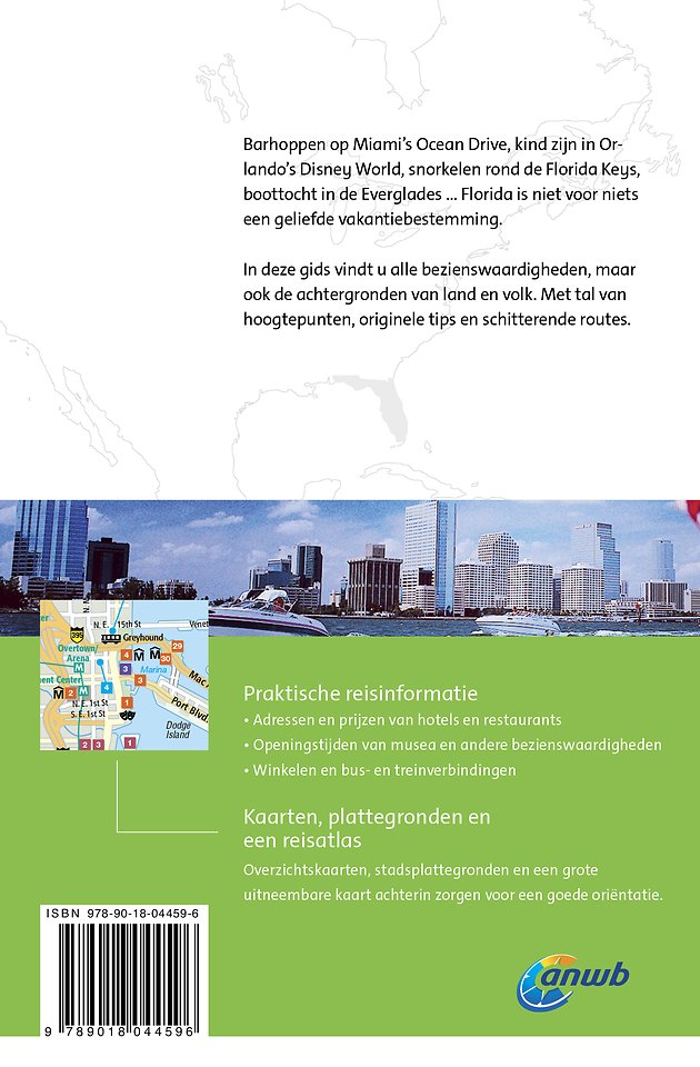 ANWB Wereld Reisgids Florida  Amerika De ANWB Wereldreisgids Florida is een compleet vernieuwd! Florida is de Amerikaanse staat van varen tussen de alligators in de Everglades, de groene weiden van Marion County en de parelwitte stranden en kleurrijke koraalriffen van de Keys. Maar ook van grote steden vol bezienswaardigheden zoals Orlando met al zijn pretparken en klein Havana in Miami. De uitgebreide Florida reisgids telt meer dan 400 paginas boordevol hoogtepunten, originele tips, schitterende wandelroutes en alles over de achtergronden van land en volk. Daarnaast alle praktische informatie zoals openingstijden van musea, tips voor overnachtingen en vervoerstijden. Inclusief stadsplattegronden, overzichtskaarten en achterin een kleine atlas. Kortom: een onmisbare ANWB gids voor een geweldige rondreis door Florida.