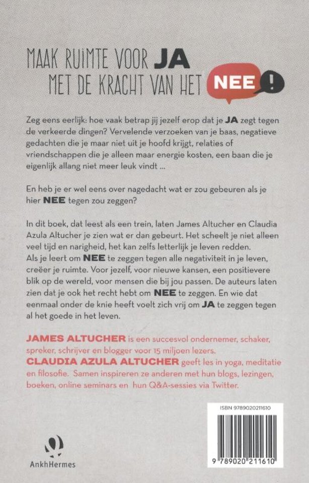 In dit boek, dat leest als een trein, laten James Altucher en Claudia Azula Altucher je zien wat er dan gebeurt. Het scheelt je niet alleen veel tijd en narigheid, het kan zelfs letterlijk je leven redden. Als je leert om NEE te zeggen tegen alle negativiteit in je leven, creëer je ruimte. Voor jezelf, voor nieuwe kansen, een positievere blik op de wereld, voor mensen die bij jou passen. De auteurs laten zien dat je ook het recht hebt om NEE te zeggen. En wie dat eenmaal onder de knie heeft voelt zich vrij om JA te zeggen tegen al het goede in het leven.