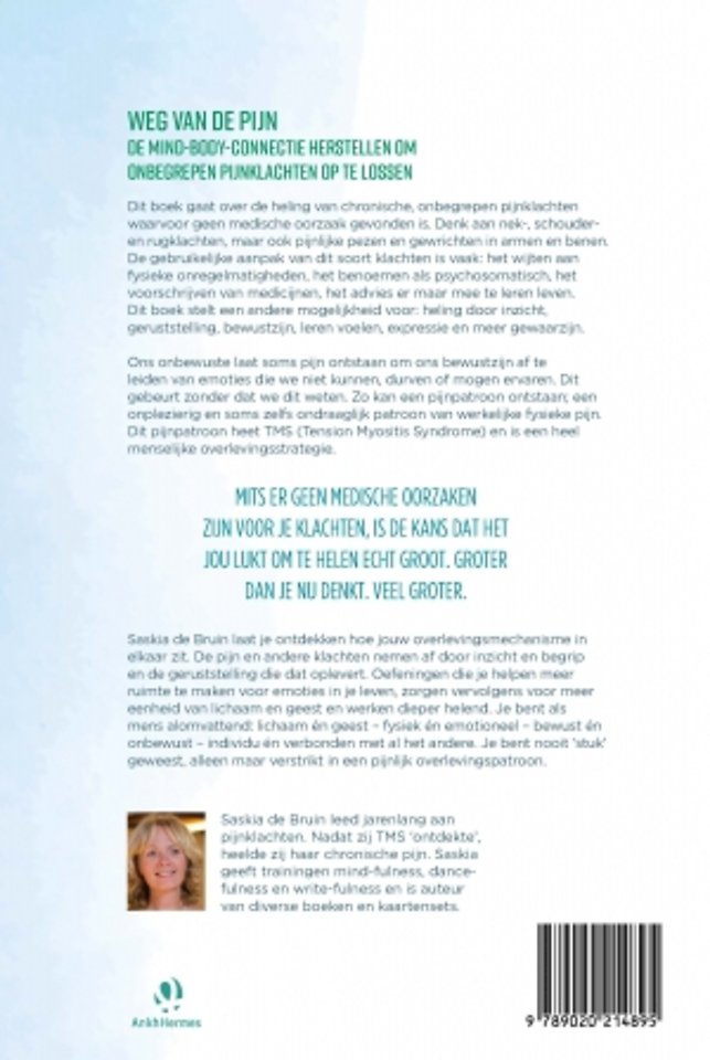 In ‘Weg van de pijn, de mind-body connectie herstellen om onbegrepen pijnklachten op te lossen’ laat Saskia de Bruin zien dat pijn vaak een verborgen agenda heeft. Ze ontdekte dat ons lichaam pijn en andere klachten kan gebruiken om ons te beschermen tegen emoties die we als bedreigend, onacceptabel of overweldigend ervaren. Bewustwording over hoe dit beschermingspatroon werkt is dan ook dé sleutel om je pijn en klachten te verlichten.