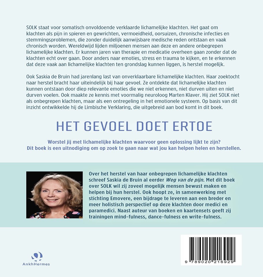 In SOLK, somatisch onvoldoende verklaarde lichamelijke klachten van Saskia de Bruin krijgen somatische klachten een naam en krijg je inzichten om een gevoelvoller leven te leiden. Veel mensen hebben last van lichamelijke klachten waarvoor artsen geen lichamelijke oorzaak kunnen vinden. De naam hiervoor is SOLK, Somatisch Onvoldoende Verklaarde Lichamelijke Klachten. Patiënten voelen zich vaak niet serieus genomen, maar tobben wel degelijk met deze klachten. Op basis van de baanbrekende inzichten van voormalig neuroloog Marten Klaver legt Saskia de Bruin uit wat SOLK is en hoe deze klachten kunnen ontstaan. Ze is pleitbezorger van een gevoelvoller leven als oplossing voor onze klachten.
