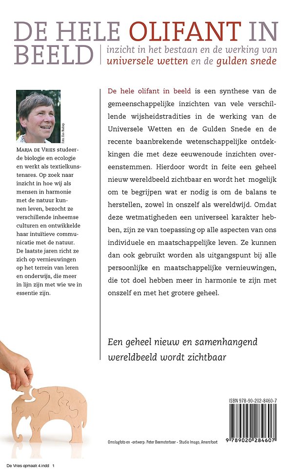 DE HELE OLIFANT IN BEELDInzicht in het bestaan en de werking van Universele Wetten en de Gulden snede"De hele olifant in beeld" is een synthese van de gemeenschappelijke inzichten van vele verschillende wijsheidstradities in de werking van de Universele Wetten en de Gulden Snede en de recente baanbrekende wetenschappelijke ontdekkingen die met deze eeuwenoude inzichten overeenstemmen. Hierdoor wordt in feite een geheel nieuw wereldbeeld zichtbaar en wordt het mogelijk om te begrijpen wat er nodig is om de balans te herstellen, zowel in onszelf als wereldwijd. Omdat deze wetmatigheden een universeel karakter hebben, zijn ze van toepassing op alle aspecten van ons individuele en maatschappelijke leven. Ze kunnen dan ook gebruikt worden als uitgangspunt bij alle persoonlijke en maatschappelijke vernieuwingen, die tot doel hebben meer in harmonie te zijn met onszelf en met het grotere geheel.Een geheel nieuw en samenhangend wereldbeeld wordt zichtbaar.