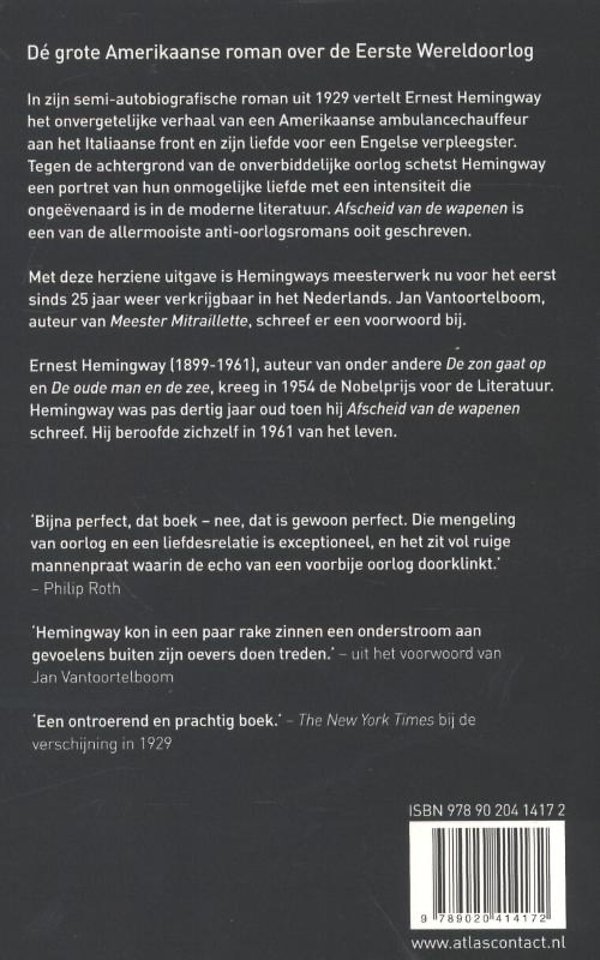 In zijn semi-autobiografische 'Afscheid van de wapenen' uit 1929 vertelt Ernest Hemingway het onvergetelijke verhaal van een Amerikaanse ambulancechauffeur aan het Italiaanse front en zijn liefde voor een Engelse verpleegster. Tegen de achtergrond van de onverbiddelijke oorlog schetst Hemingway een portret van hun onmogelijke liefde met een intensiteit die ongeëvenaard is in de moderne literatuur. Afscheid van de wapenen is een van de allermooiste anti-oorlogsromans ooit geschreven.