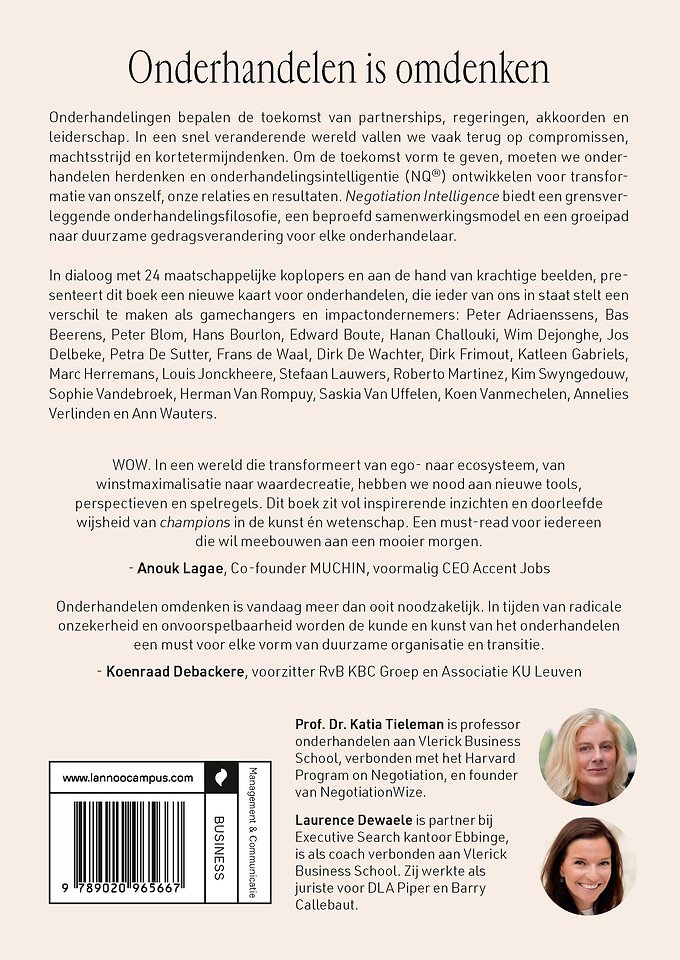 Prof. Dr. Katia Tieleman is professor in Onderhandelen en Conflict Management aan de Vlerick Business School. Ze is een vooraanstaande internationale autoriteit op het gebied van onderhandelen en verbonden met het Harvard Program on Negotiation aan de Harvard Law School. Via o.m. haar adviesbureau NegotiationWize heeft ze 20 jaar ervaring als toponderhandelaar en adviseur.