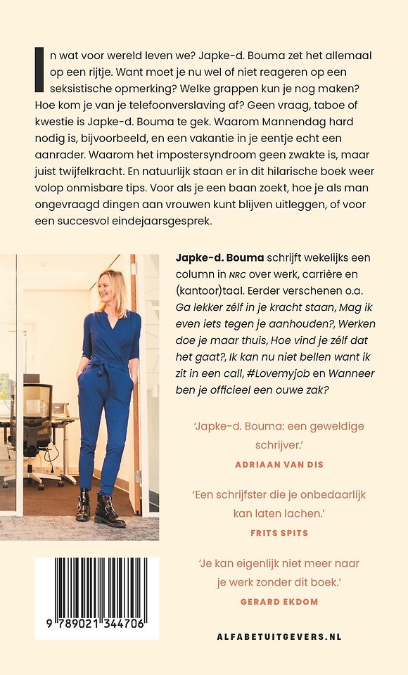 In wat voor wereld leven we? Japke-d. Bouma zet het allemaal op een rijtje. Want moet je nu wel of niet reageren op een seksistische opmerking? Welke grappen kun je nog maken? Hoe kom je van je telefoonverslaving af? Geen vraag, taboe of kwestie is Japke-d. Bouma te gek. Waarom Mannendag hard nodig is, bijvoorbeeld, en een vakantie in je eentje echt een aanrader. Waarom het impostersyndroom geen zwakte is, maar juist twijfelkracht. En natuurlijk staan er in dit hilarische boek weer volop onmisbare tips. Voor als je een baan zoekt, hoe je als man ongevraagd dingen aan vrouwen kunt blijven uitleggen, of voor een succesvol eindejaarsgesprek.