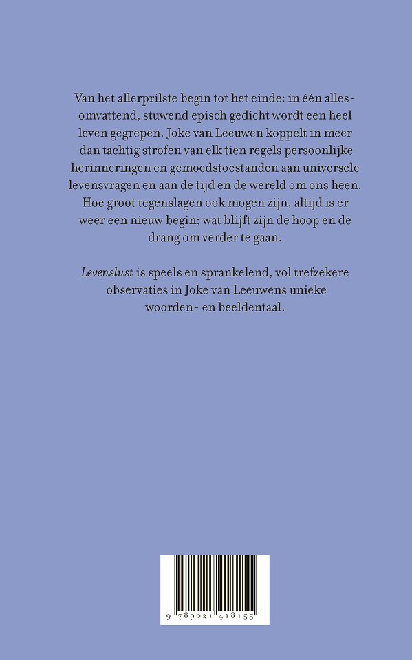 Levenslust is speels en sprankelend, vol trefzekere observaties in Joke van Leeuwens unieke woorden- en beeldentaal.