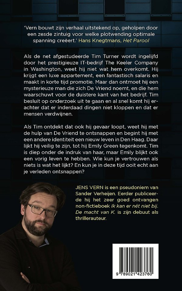 'Echt een ontzettend goed geschreven en spannende thriller. De korte hoofdstukken vanuit wisselend perspectieven houden de vaart er goed in. Behalve dat het een ontzettend spannend boek is, snijdt het ook een heel belangrijk en actueel thema aan: hoe gaan bedrijven met (onze) data om.' **** Jeroen Windmeijer