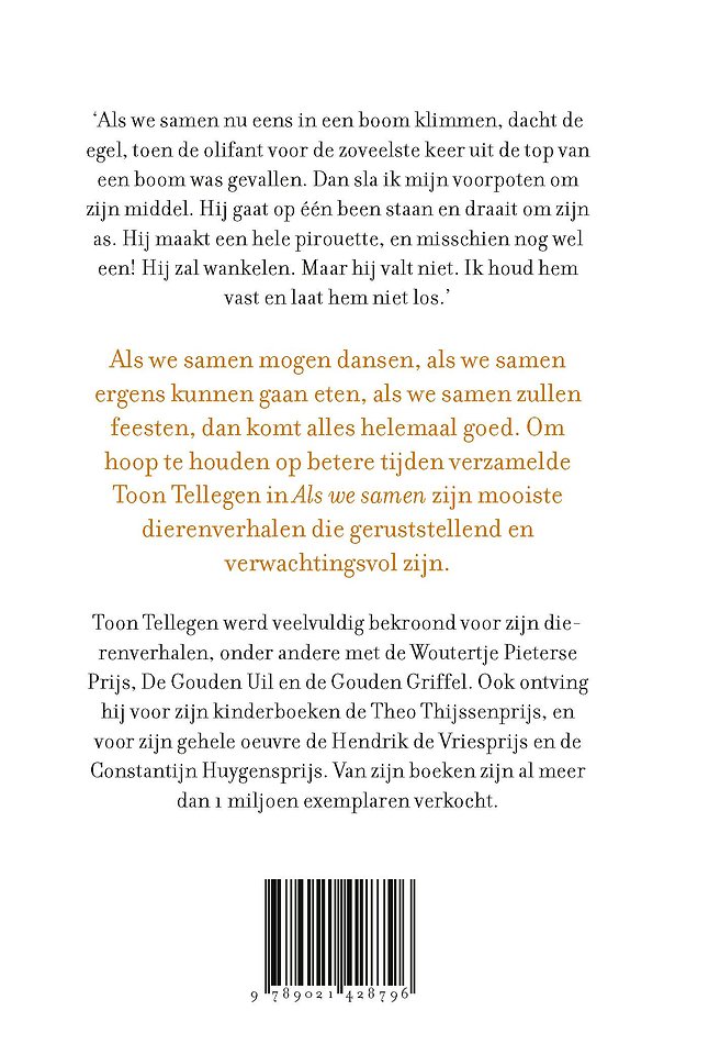 Als we samen mogen dansen, als we samen ergens kunnen gaan eten, als we samen zullen feesten, dan komt alles helemaal goed. Om hoop te houden op betere tijden verzamelde Toon Tellegen in Als we samen zijn mooiste dierenverhalen die geruststellend en verwachtingsvol zijn.