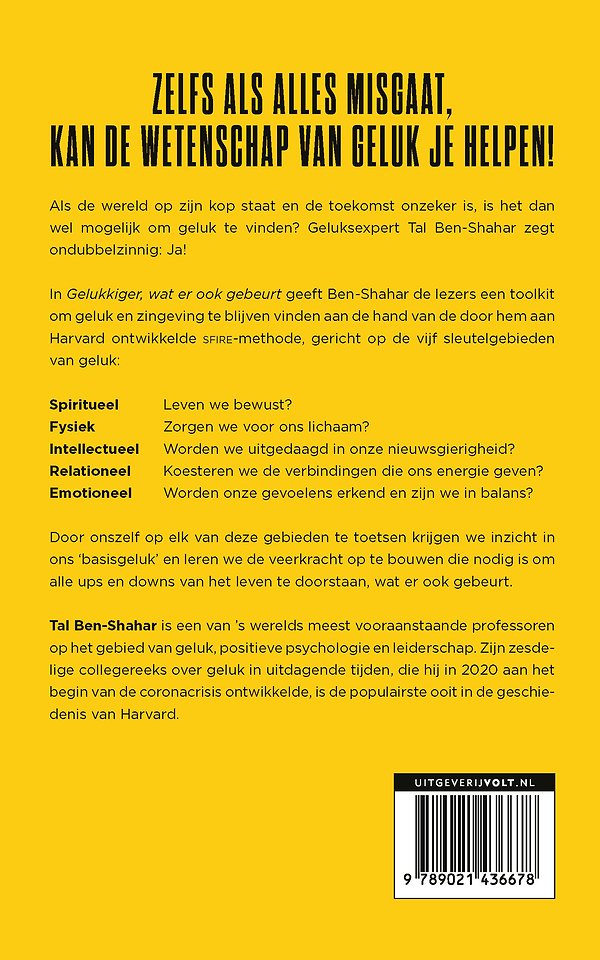 In 'Gelukkiger, wat er ook gebeurt' geeft Ben-Shahar de lezers een toolkit om geluk en zingeving te blijven vinden aan de hand van de door hem aan Harvard ontwikkelde sfire-methode, gericht op de vijf sleutelgebieden van geluk: