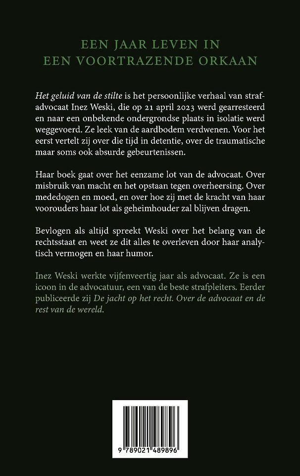 Op vrijdag 19 april verschijnt Het geluid van de stilte, het persoonlijke verhaal van strafadvocaat Inez Weski, die op 21 april 2023 werd gearresteerd en naar een onbekende ondergrondse plaats in isolatie werd weggevoerd. Ze leek van de aardbodem verdwenen. Voor het eerst vertelt zij over die tijd in detentie, en over de traumatische maar soms ook absurde gebeurtenissen die volgden.