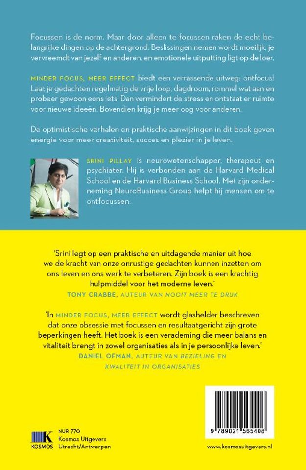 ‘Minder focus, meer effect’ van Srini Pillay is het tegengeluid over focus en discipline. Focus is de norm. Maar door alleen te focussen raken de echt belangrijke dingen op de achtergrond. Beslissingen nemen wordt moeilijk, je vervreemdt van jezelf en anderen, en emotionele uitputting ligt op de loer.