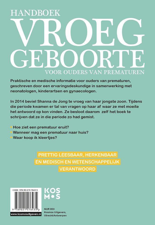 Het Handboek vroeggeboorte voor prematuur ouders van ervaringsdeskundige Shanna de Jong is een informatief en praktisch naslagwerk voor ouders van te vroeg geboren baby’s. De geboorte van een baby vóór 37 weken zwangerschapsduur roept vaak veel vragen op bij jonge ouders. Het Handboek vroeggeboorte voor prematuur ouders is het eerste boek dat antwoord geeft op al die vragen. In dit boek, geschreven in samenwerking neonatologen, jeugdartsen en gynaecologen, vind je praktische én medische informatie. Een toegankelijk en herkenbaar naslagwerk voor iedere ouder van de 12.000 kinderen die jaarlijks te vroeg worden geboren.