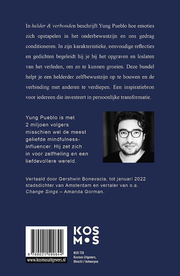 'Helder & verbonden' is de nieuwe verzameling reflecties van influencer Yung Pueblo. Hij leidt je in deze bundel moeiteloos door een innerlijke transformatie om je relaties te verdiepen en versterken. Intense emoties kunnen zich opstapelen in het onderbewustzijn en ervoor zorgen dat je op een bepaalde manier reageert. Daar word je zelden gelukkig van, en je geliefden ook niet. Met begrip voor waar je vandaan komt en wat je hebt meegemaakt, kun je hier inzicht in krijgen. Met als resultaat dat relaties dieper en authentieker worden.