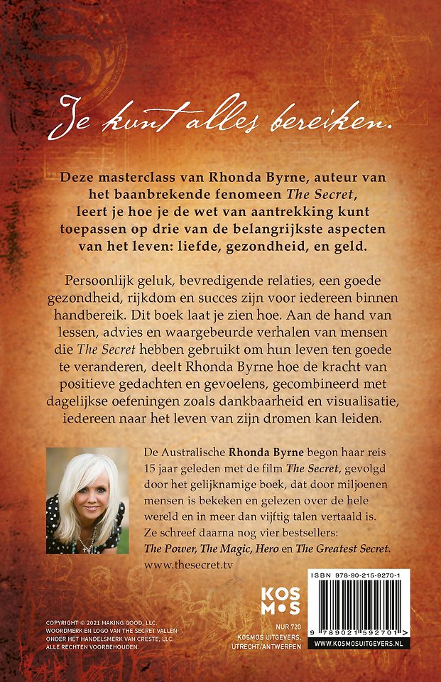 De wet van de aantrekkingskracht – met positieve gedachten trek je positieve dingen aan, met negatieve gedachten negatieve dingen – wordt in deze masterclass toegespitst op drie van de belangrijkste aspecten van het leven: liefde, gezondheid en geld. Met deze verzameling lessen, adviezen en casestudy’s worden persoonlijk geluk, welzijn en succes voor iedereen haalbaar.