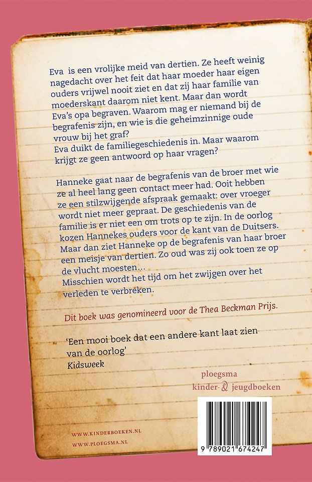 Eva is een vrolijke meid van dertien. Ze heeft weinig nagedacht over het feit dat haar moeder haar eigen ouders vrijwel nooit ziet en dat zij haar familie van moederskant daarom niet kent. Maar dan wordt Eva’s opa begraven. Waarom mag er niemand bij de begrafenis zijn, en wie is die geheimzinnige oude vrouw bij het graf?