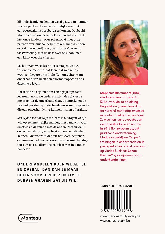 Dat rationele argumenten belangrijk zijn weet iedereen, maar we onderschatten de rol van de mens achter de onderhandelaar, de emoties en de psychologie die bij onderhandelen komen kijken én die een onderhandeling kunnen maken of kraken. Met liefde onderhandel je ook leert je te vragen wat je wil, op een menselijke manier, met aandacht voor emoties en de relatie met de ander.