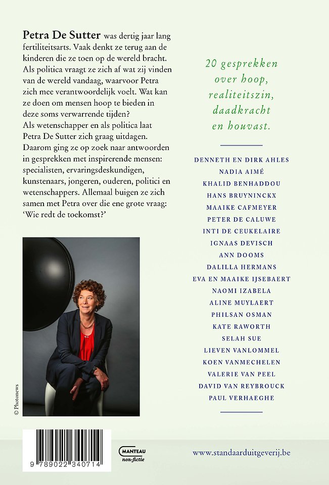 Als wetenschapper en als politica laat Petra De Sutter zich graag uitdagen. Daarom ging ze op zoek naar antwoorden in gesprekken met inspirerende mensen: specialisten, ervaringsdeskundigen, kunstenaars, jongeren, ouderen, politici en wetenschappers. Allemaal buigen ze zich samen met Petra over die ene grote vraag: 'Wie redt de toekomst?'