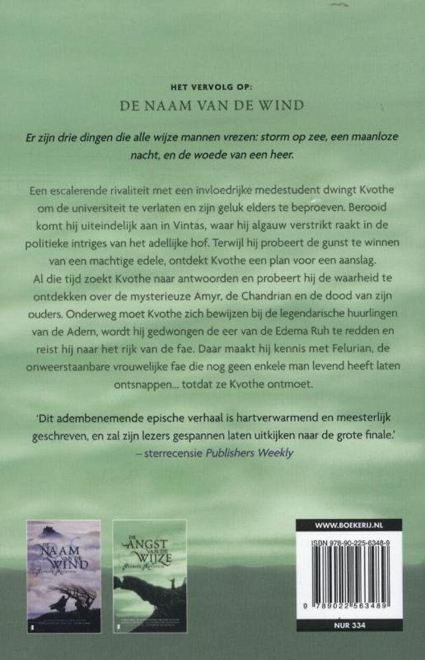 ‘Er zijn drie dingen die alle wijze mannen vrezen: storm op zee, een maanloze nacht, en de woede van een heer.’Een escalerende machtsstrijd met een machtige edelman dwingt Kvothe, de held uit De naam van de wind, om de Universiteit te verlaten en zijn geluk elders te beproeven. Zwervend, berooid en alleen reist hij naar Vintas, waar hij algauw verstrikt raakt in de politieke intriges van het koningshuis. Terwijl hij machtige vrienden probeert te maken, ontdekt Kvothe een plan voor een aanslag. En ook ontmoet hij Felurian, de onweerstaanbare fee die met haar betovering al menig man in het ongeluk heeft gestort. Door haar leert Kvothe veel over de aard en de magische aantrekkingskracht van vrouwen. In De angst van de wijze zet Kvothe zijn eerste stapjes op het pad naar heldendom en leert hij hoe moeilijk het leven kan zijn als je een levende legende dreigt te worden.