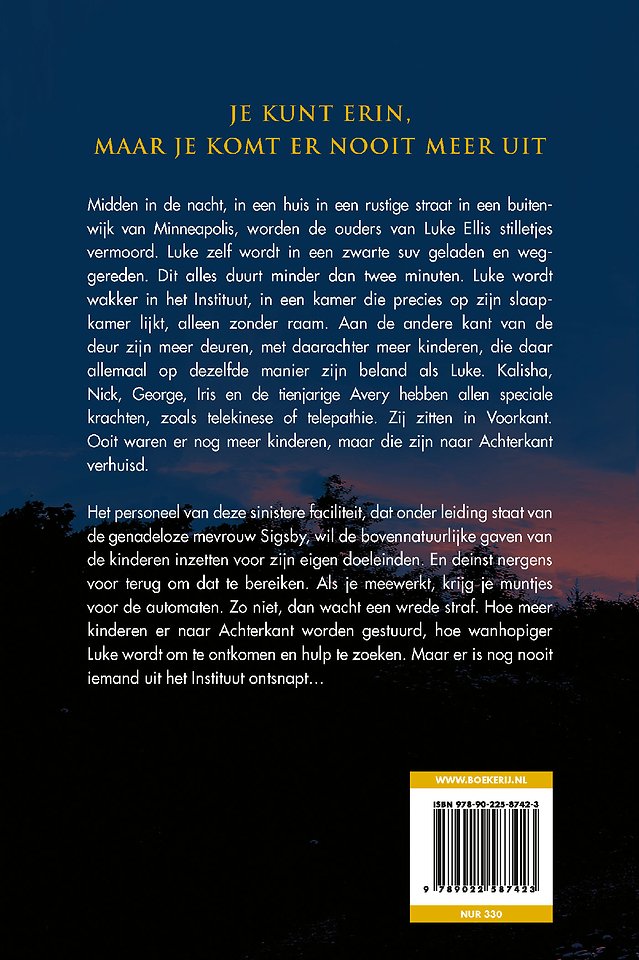 Het personeel van deze sinistere faciliteit, dat onder leiding staat van de genadeloze mevrouw Sigsby, wil de bovennatuurlijke gaven van de kinderen inzetten voor zijn eigen doeleinden. En deinst nergens voor terug om dat te bereiken. Als je meewerkt, krijg je muntjes voor de automaten. Zo niet, dan wacht een wrede straf. Hoe meer kinderen er naar Achterkant worden gestuurd, hoe wanhopiger Luke wordt om te ontkomen en hulp te zoeken. Maar er is nog nooit iemand uit het Instituut ontsnapt…