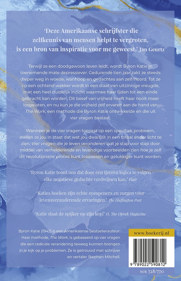 Byron Katie (1942) is een Amerikaanse bestsellerauteur. Haar methode, The Work, is gebaseerd op vier vragen die een radicale verandering teweeg kunnen brengen in je kijk op je problemen.