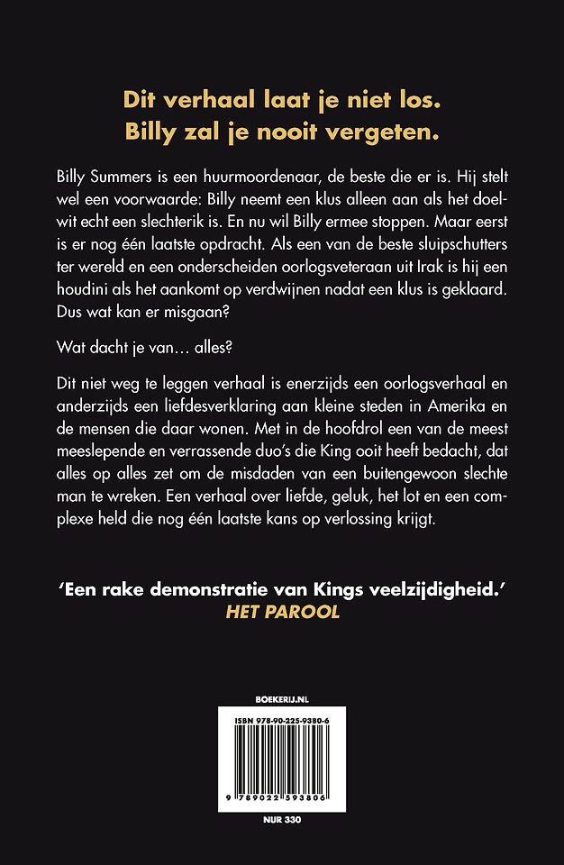 'Billy Summers had gerust een paar honderd pagina's meer mogen zijn, de koning laat eens te meer overtuigend zien dat hij tot de allerbesten behoort.' VN Detective & Thrillerbrief