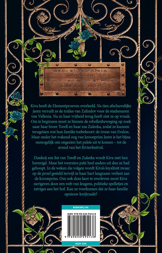 Kiva Meridan heeft de Elementproeven overleefd. Na tien afschuwelijke jaren verruilt ze de tralies van Zalindov voor de stadsmuren van Vallenia. Nu ze haar vrijheid terug heeft kan ze zich richten op het doel waar ze al sinds haar arrestatie op zint: wraak. Om te beginnen moet ze binnen de rebellenbeweging op zoek naar haar broer Torell en haar zus Zuleeka, zodat ze kunnen terugeisen wat hun familie toebehoort: de troon van Evalon. Maar onder het wakend oog van kroonprins Jaren is het bijna onmogelijk om ongezien het paleis uit te komen – tot de avond van het rivierfestival.
