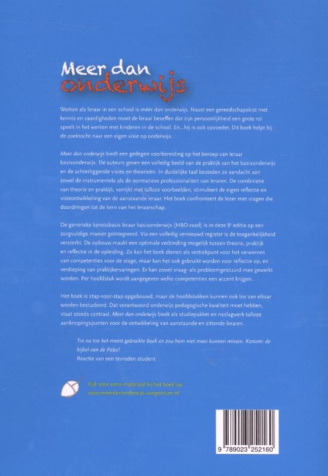 Meer dan onderwijs biedt een gedegen voorbereiding op het beroep van leraar basisonderwijs. De auteurs geven een volledig beeld van de praktijk van het basisonderwijs en de achterliggende visies en theorieën. In duidelijke taal besteden ze aandacht aan zowel de instrumentele als de normatieve professionaliteit van leraren. De combinatie van theorie en praktijk, verrijkt met talloze voorbeelden, stimuleert de eigen reflectie en visieontwikkeling van de aanstaande leraar. Het boek confronteert de lezer met vragen die doordringen tot de kern van het leraarschap.