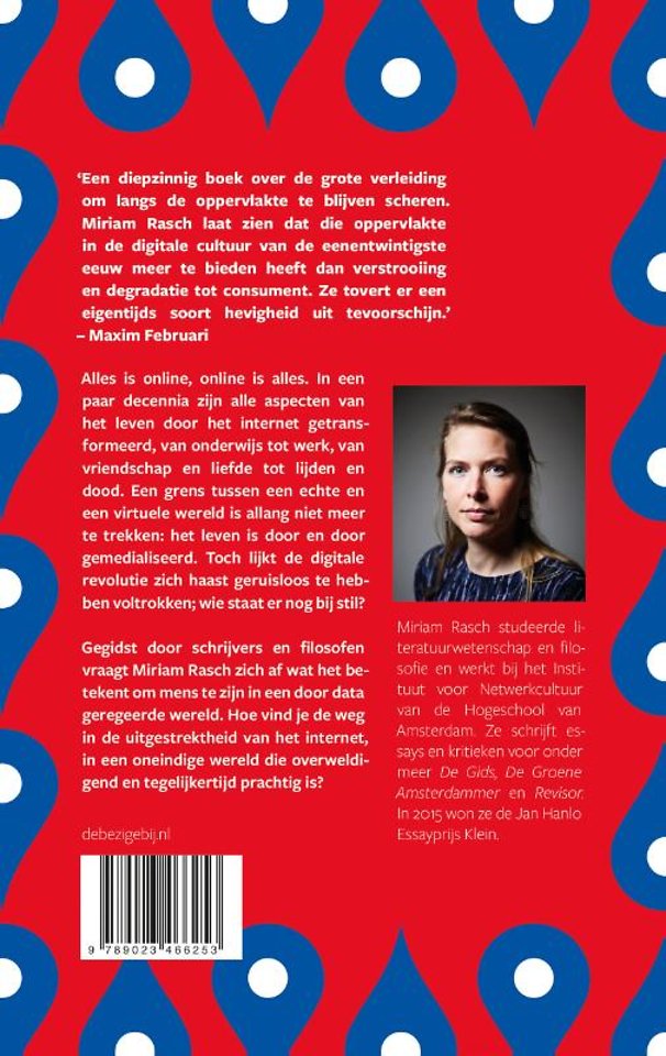 Miriam Rasch werd tegelijk met het internet volwassen. In deze essaybundel probeert ze te doorgronden hoe digitale ontwikkelingen ons hebben veranderd. Geïnspireerd door schrijvers en filosofen vraagt ze zich af wat het betekent om mens te zijn in een door data geregeerde wereld. Hoe vind je de weg in de uitgestrektheid van het internet, in een oneindige wereld die overweldigend en tegelijkertijd prachtig is?