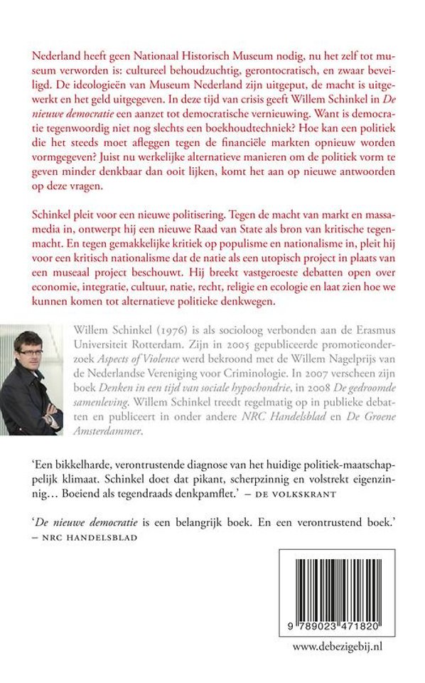 Nederland heeft geen Nationaal Historisch Museum nodig, nu het zelf tot museum verworden is: cultureel behoudzuchtig, gerontocratisch, en zwaar beveiligd. De ideologieën van Museum Nederland zijn uitgeput, de macht is uitgewerkt en het geld uitgegeven. In deze tijd van crisis geeft Willem Schinkel in 'De nieuwe democratie' een aanzet tot democratische vernieuwing. Want is democratie tegenwoordig niet nog slechts een boekhoudtechniek? Hoe kan een politiek die het steeds moet afleggen tegen de financiële markten opnieuw worden vormgegeven? Juist nu werkelijke alternatieve manieren om de politiek vorm te geven minder denkbaar dan ooit lijken, komt het aan op nieuwe antwoorden op deze vragen.