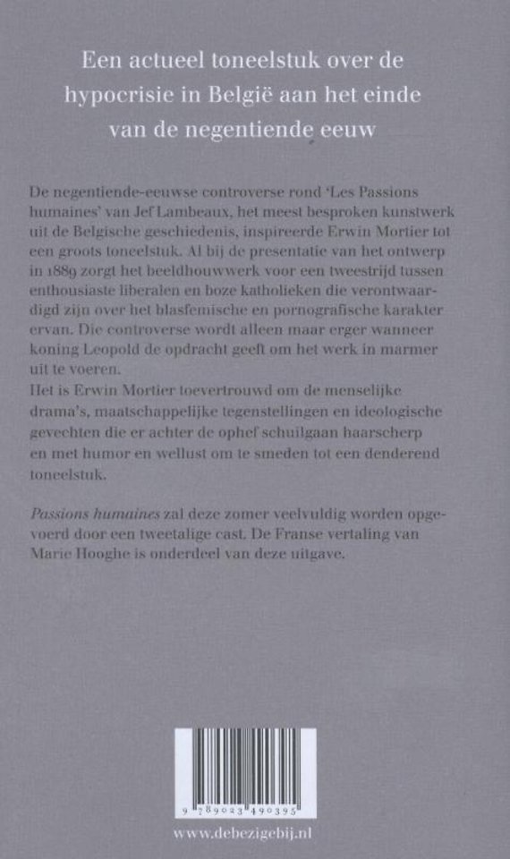 De negentiende-eeuwse controverse rond ‘Les Passions humaines’ van Jef Lambeaux, het meest besproken kunstwerk uit de Belgische geschiedenis, inspireerde Erwin Mortier tot een groots toneelstuk. Al bij de presentatie van het ontwerp in 1889 zorgt het beeldhouwwerk voor een tweestrijd tussen enthousiaste liberalen en boze katholieken die verontwaardigd zijn over het blasfemische en pornografi sche karakter ervan. Die controverse wordt alleen maar erger wanneer koning Leopold de opdracht geeft om het werk in marmer uit te voeren.