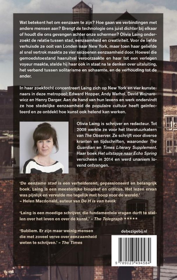 Wat betekent het om eenzaam te zijn? Hoe gaan we verbindingen aan met andere mensen? Brengt de technologie ons dichter bij elkaar of houdt die ons gevangen achter onze schermen? Olivia Laing onderzoekt de relatie tussen stad, eenzaamheid en creativiteit. Voor de liefde verhuisde ze ooit van Londen naar New York, maar toen die liefde al snel vertrok maakte ze vier seizoenen eenzaamheid door. Hoewel die gemoedstoestand haaruitval veroorzaakte en haar tot een verlegen voyeurist maakte, stelde die haar ook in staat na te denken over uitsluiting, het verband tussen solitarisme en schaamte, en de verhouding tot de ander.