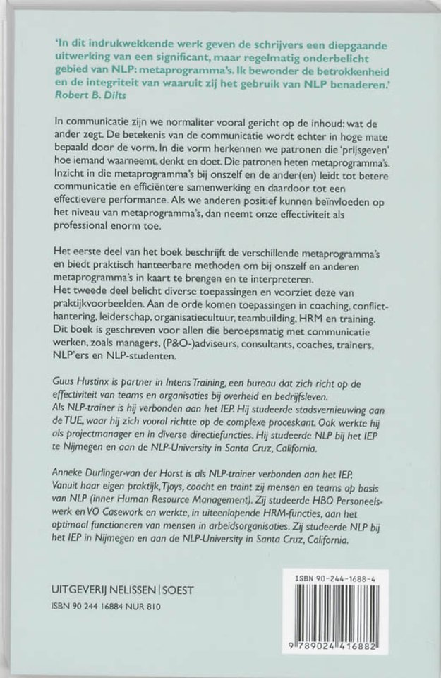 Het eerste deel van het boek beschrijft de verschillende metaprogramma's en biedt praktisch hanteerbare methoden om bij onszelf en anderen metaprogramma's in kaart te brengen en te interpreteren. Het tweede deel belicht diverse toepassingen en voorziet deze van praktijkvoorbeelden. Aan de orde komen toepassingen in coaching, conflicthantering, leiderschap, organisatiecultuur, teambuilding, HRM en training. Dit boek is geschreven voor allen die beroepsmatig met communicatie werken, zoals managers, (P&O)-adviseurs, consultants, coaches, trainers, NLP'ers en NLP studenten.