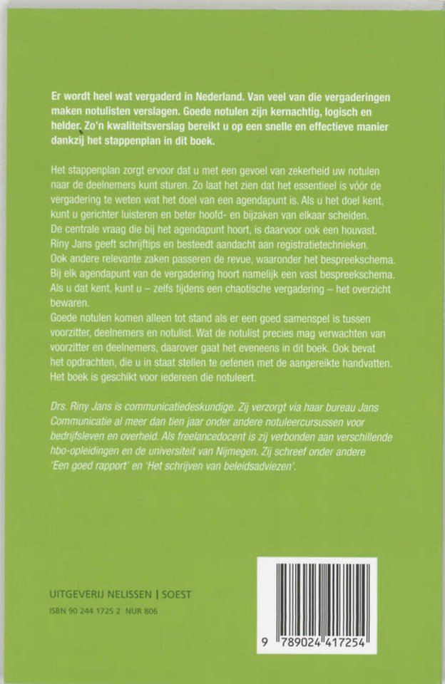 Er wordt heel wat vergaderd in Nederland. Van veel van die vergaderingen maken notulisten verslagen. Goede notulen zijn kernachtig, logisch en helder. Zo'n kwaliteitsverslag bereikt u op een snelle en effectieve manier dankzij het stappenplan in dit boek.