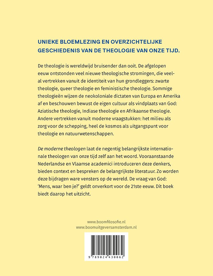 De moderne theologen laat de negentig belangrijkste internationale theologen van onze tijd zelf aan het woord. Vooraanstaande Nederlandse en Vlaamse academici introduceren deze denkers, bieden context en bespreken de belangrijkste literatuur. Zo worden deze bijdragen ware vensters op de wereld. De vraag van God: ‘Mens, waar ben je?’ geldt onverkort voor de 21ste eeuw. Dit boek biedt daarop het uitzicht.