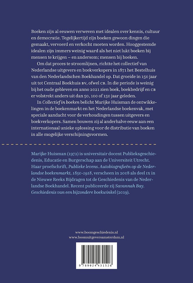 In Collectief in boeken belicht Marijke Huisman de ontwikkelingen in de boekenmarkt en het Nederlandse boekenvak, met speciale aandacht voor de verhoudingen tussen uitgevers en boekverkopers. Samen bouwen zij anderhalve eeuw geleden aan een internationaal unieke oplossing voor de distributie van boeken in alle mogelijke verschijningsvormen.
