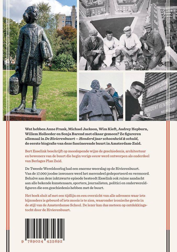 Wat hebben Anne Frank, Michael Jackson, Wim Kieft, Audrey Hepburn, Willem Holleeder en Sonja Barend met elkaar gemeen? Ze figureren allemaal in De Rivierenbuurt. Honderd jaar schoonheid & schuld, de eerste biografie van deze fascinerende wijk in Amsterdam-Zuid. Het boek beschrijft de geschiedenis, architectuur en bewoners van de Rivierenbuurt.