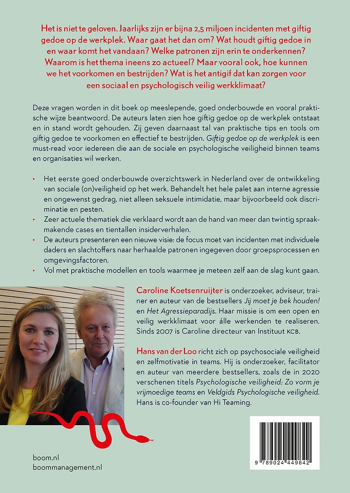 Deze vragen worden in dit boek op meeslepende, goed onderbouwde en vooral praktische wijze beantwoord. De auteurs laten zien hoe giftig gedoe op de werkplek ontstaat en in stand wordt gehouden. Zij geven daarnaast tal van praktische tips en tools om giftig gedoe te voorkomen en effectief te bestrijden. 'Giftig gedoe op de werkplek' is een must-read voor iedereen die aan de sociale en psychologische veiligheid binnen teams en organisaties wil werken.