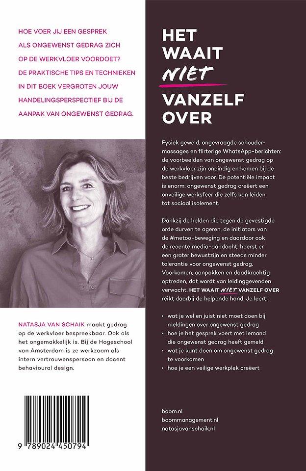 Natasja van Schaik helpt bedrijven hun infrastructuur voor sociale veiligheid te verbeteren, het bewustzijn te verhogen en sociale veiligheid te borgen. Daarnaast is ze interne vertrouwenspersoon en docent behavioural design bij Hogeschool van Amsterdam.