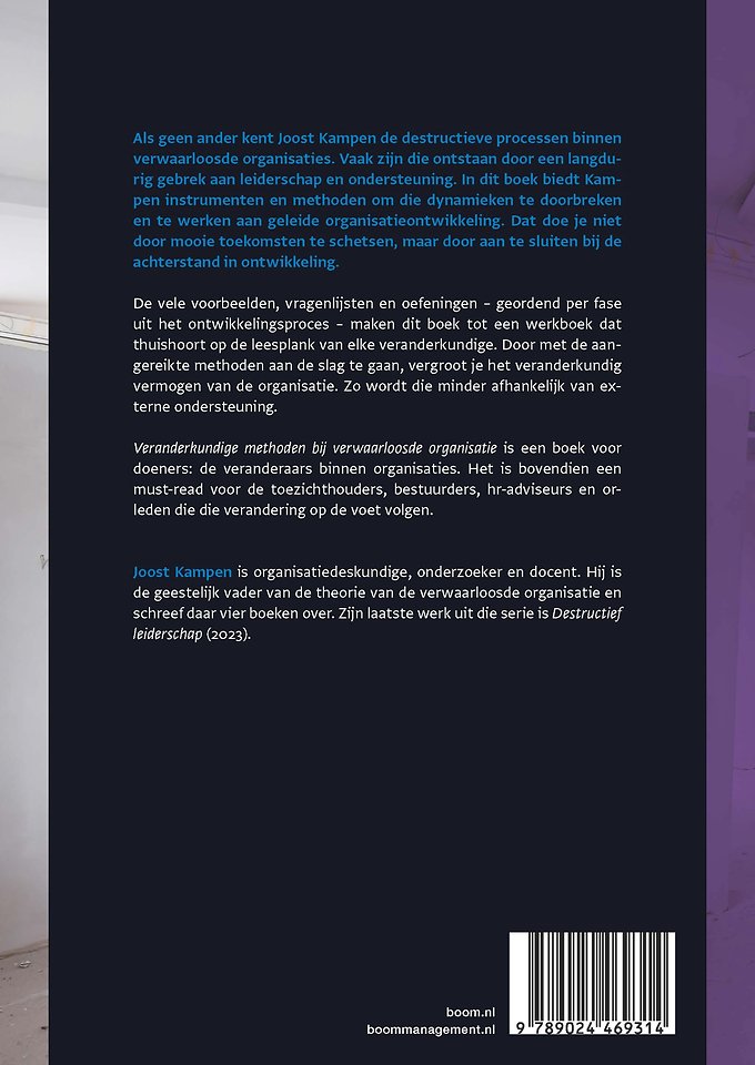 Als geen ander kent Joost Kampen de destructieve processen binnen verwaarloosde organisaties. Vaak zijn die ontstaan door een langdurig gebrek aan leiderschap en ondersteuning. In dit boek biedt Kampen instrumenten en methoden om die dynamieken te doorbreken en te werken aan geleide organisatieontwikkeling. Dat doe je niet door mooie toekomstbeelden te schetsen, maar door aan te sluiten bij de achterstand in ontwikkeling van de organisatie en de medewerkers.