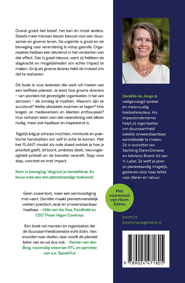 Wil jij op je werk eindelijk écht planeetvriendelijker handelen, maar weet je niet waar te beginnen? Dit boek geeft je precies die schop onder je kont die je nodig hebt. Met haar frisse blik en onweerstaanbare enthousiasme laat Daniëlle je zien hoe makkelijk en leuk het is om het verschil te maken. – Hille van der Kaa, Foodheld en CEO Those Vegan Cowboys