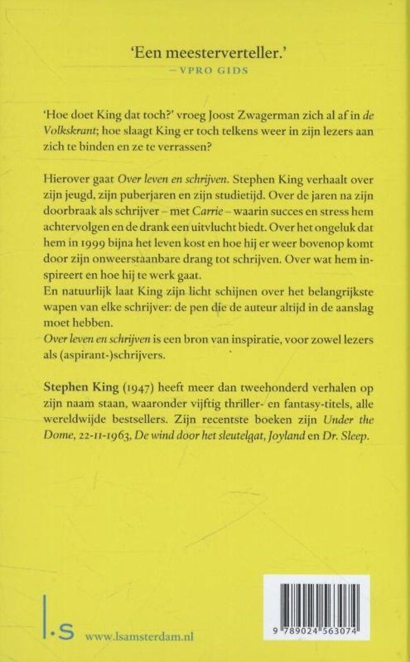 'Een meesterverteller.' - VPRO Gids'Hoe doet King dat toch?' vroeg Joost Zwagerman zich al af in de Volkskrant; hoe slaagt King er toch telkens weer in zijn lezers aan zich te binden en ze te verrassen?Hierover gaat Over leven en schrijven. Stephen King verhaalt over zijn jeugd, zijn puberjaren en zijn studietijd. Over de jaren na zijn doorbraak als schrijver - met Carrie - waarin succes en stress hem achtervolgen en de drank een uitvlucht biedt. Over het ongeluk dat hem in 1999 bijna het leven kost en hoe hij er weer bovenop komt door zijn onweerstaanbare drang tot schrijven. Over wat hem inspireert en hoe hij te werk gaat.En natuurlijk laat King zijn licht schijnen over het belangrijkste wapen van elke schrijver: de pen die de auteur altijd in de aanslag moet hebben.Over leven en schrijven is een bron van inspiratie, voor zowel lezers als (aspirant-)schrijvers. Stephen King (1947) heeft meer dan tweehonderd verhalen op zijn naam staan, waaronder vijftig thriller- en fantasy-titels, alle wereldwijde bestsellers. Zijn recentste boeken zijn Under the Dome, 22-11-1963, De wind door het sleutelgat, Joyland en Dr. Sleep.