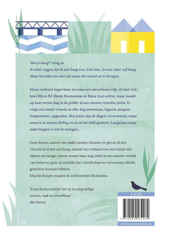 Marie verhuist tegen haar zin naar een nieuwbouwwijk. Ze laat Zoë, haar BB en BZ (Beste Buurmeisje en Bijna Zus) achter, maar maakt op haar eerste dag in de polder al een nieuwe vriendin: Jente. Er volgt een zomer waarin ze elke dag zwemmen, logeren, jongens bespioneren, opgroeien. Met Jente zijn de dagen vol avontuur, maar soms is ze ineens driftig, en af en toe zelfs gemeen. Naarmate de zomer vordert, begint er iets te wringen bij Marie. Moet je elkaar altijd kunnen vertrouwen, zoals ze Zoë vertrouwde, of kan vriendschap ook heel anders zijn?