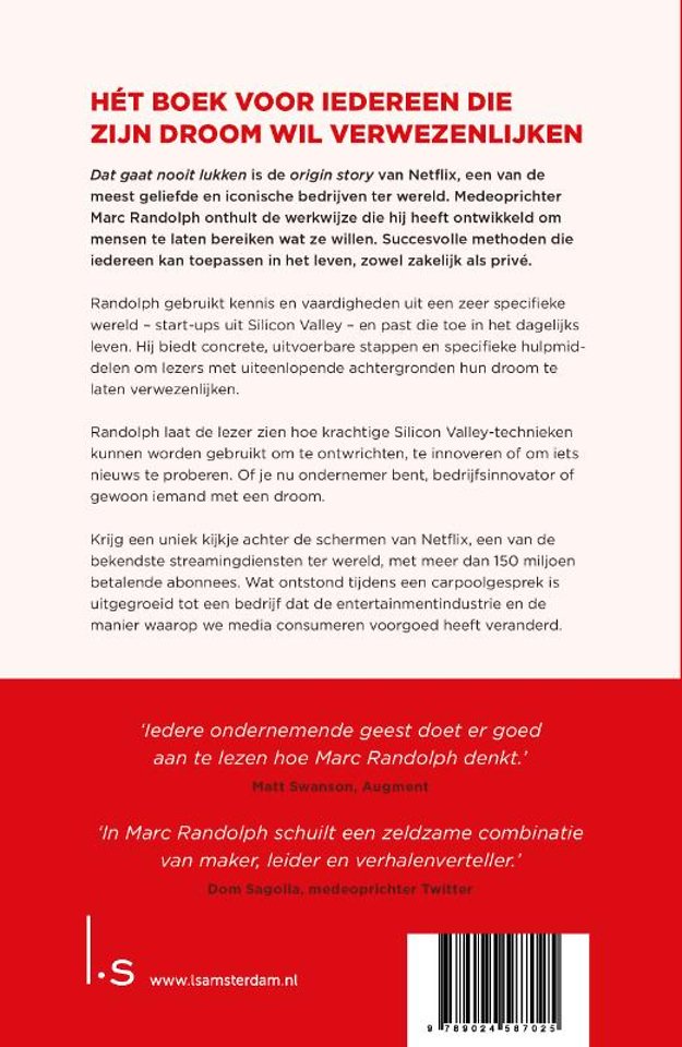 Dat gaat nooit lukken is de origin story van Netflix, een van de meest geliefde en iconische bedrijven ter wereld. Medeoprichter Marc Randolph onthult de methoden die hij heeft ontwikkeld om mensen te laten bereiken wat ze willen. Methoden die iedereen kan leren, in zaken en in het leven.