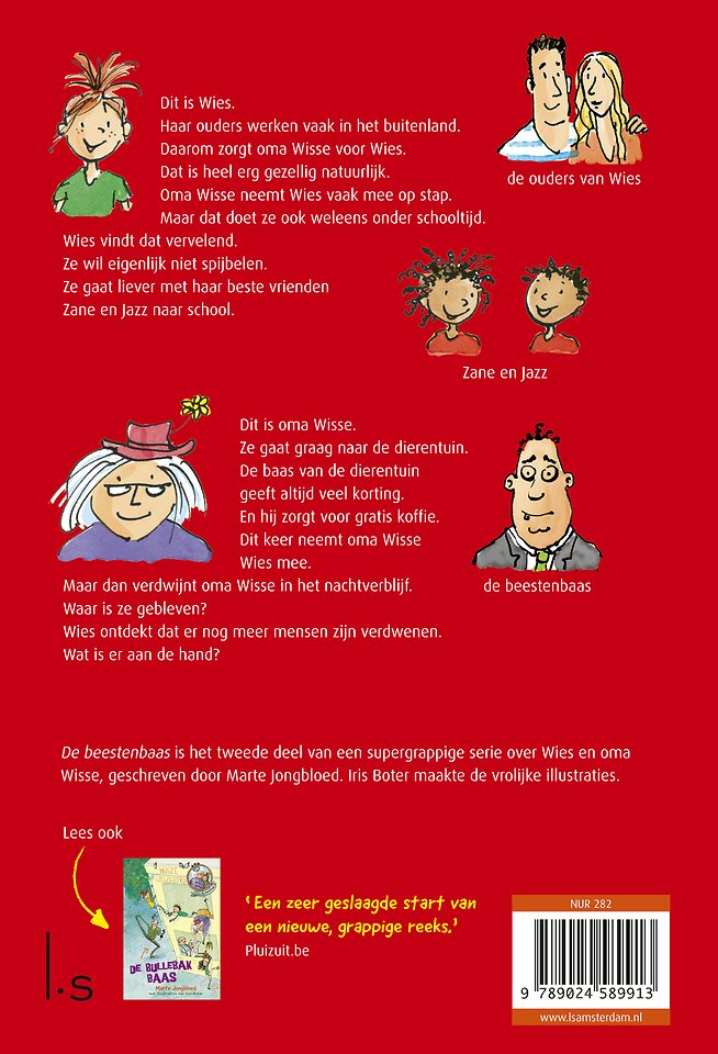 Wies & oma Wisse – De beestenbaas van Pluim-winnares en Herre-auteur Marte Jongbloed en illustrator Iris Boter is het grappige vervolg op De bullebakbaas. Wies & oma Wisse is een supervrolijke en toegankelijke serie voor kinderen vanaf 6 jaar, met fullcolour illustraties.