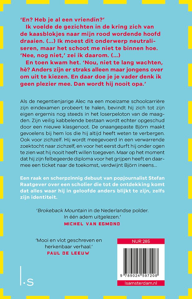 coming-of-age lhbtiq+ seksualiteit identiteit homoseksualiteit jeugdliteratuur zelfacceptatie eerste liefde vriendschap school persoonlijke groei roman nederlands liefde angst moed coming-out instinct innerlijke stem adolescentie verwarring zelfbeeld geheimen emotionele groei sociale acceptatie eindexamen volwassen worden twijfel kwetsbaarheid relaties