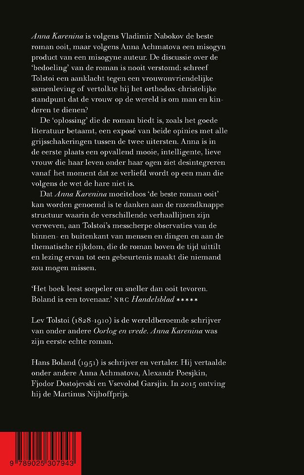 Dat Anna Karenina moeiteloos 'de beste roman ooit' kan worden genoemd is te danken aan de razendknappe structuur waarin de verschillende verhaallijnen zijn verweven, aan Tolstoi's messcherpe observaties van de binnen- en buitenkant van mensen en dingen, en aan de thematische rijkdom, die de roman boven de tijd uittilt en lezing ervan tot een gebeurtenis maakt die niemand zou mogen missen.
