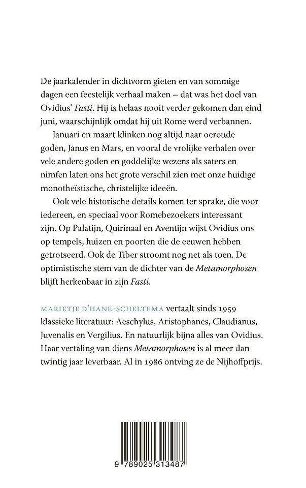 Ook vele historische details komen ter sprake, die voor iedereen, en speciaal voor Romebezoekers interessant zijn. Op Palatijn, Quirinaal en Aventijn wijst Ovidius ons op tempels, huizen en poorten die de eeuwen hebben getrotseerd. Ook de Tiber stroomt nog net als toen. De optimistische stem van de dichter van de Metamorphosen blijft herkenbaar in zijn Fasti.