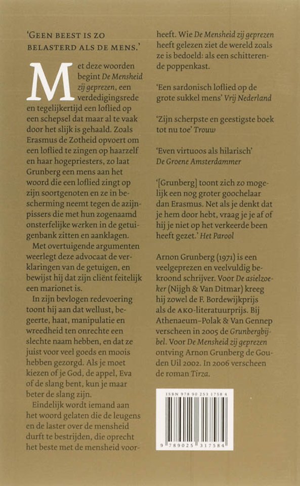 Met deze woorden begint De Mensheid zij geprezen, een verdedigingsrede en tegelijkertijd een loflied op een schepsel dat maar al te vaak door het slijk is gehaald. Zoals Erasmus de Zotheid opvoert om en loflied te zingen op haarzelf en haar hogepriesters, zo laat Grunberg een mens aan het woord die een loflied zingt op zijn soortgenoten en ze in be-scherming neemt tegen de azijn-pissers die met hun zogenaamd onsterfelijke werken in de getuigenbank zitten en aanklagen.