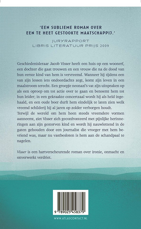 ‘Visser’ van Rob van Essen is een hartverscheurende roman over ironie, onmacht en onverwerkt verdriet. Geschiedenisleraar Jacob Visser heeft een huis op een woonerf, een dochter die gaat trouwen en een vrouw die van hem is vervreemd. Wanneer hij tijdens een van zijn lessen iets ondoordachts zegt, komt zijn leven in een maalstroom terecht. Een groepje neonazi’s vat zijn uitspraken op als een oproep om tot actie over te gaan en benoemt hem tot hun leider. Terwijl de wereld om hem heen steeds vreemdere vormen aanneemt, ziet Visser zich geconfronteerd met pijnlijke herinneringen aan zijn gestorven kind en wordt hij nauwlettend in de gaten gehouden door een journalist die vroeger met hem bevriend was, maar nu vastbesloten is hem aan de schandpaal te nagelen.